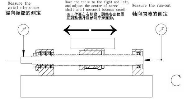 安裝螺桿時(shí),用百分表或百分表測(cè)量螺桿支撐座的固定端(滾珠絲杠軸端的跳動(dòng)量)和螺桿支撐座的支撐端(軸向間隙),并按技術(shù)要求進(jìn)行調(diào)整,以滿足機(jī)床的精度要求。
